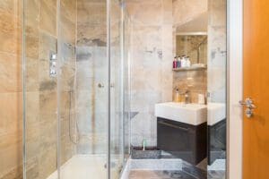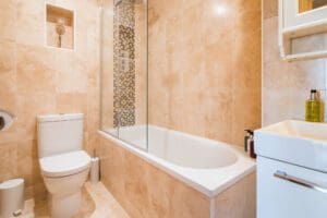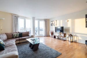 The home has three bedrooms with UK Double beds in each. The master bed has a modern ensuite bathroom with a shower. There is a second family bathroom fit with a bathtub and shower for guest use. The second bedroom boasts an additional balcony, with East facing views of Greenwich.